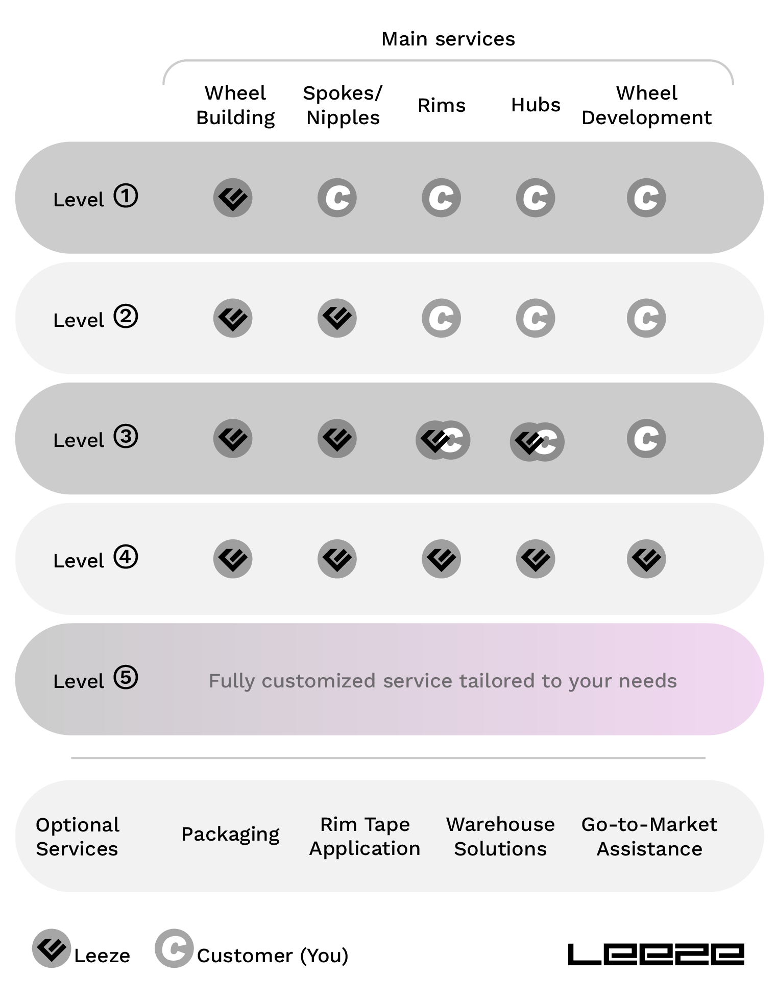 Depending on the level of support you need, you can choose between 5 different service levels. From wheel building only, up to a completely customized service solution. We also offer optional services like rim tape application or warehouse solutions.